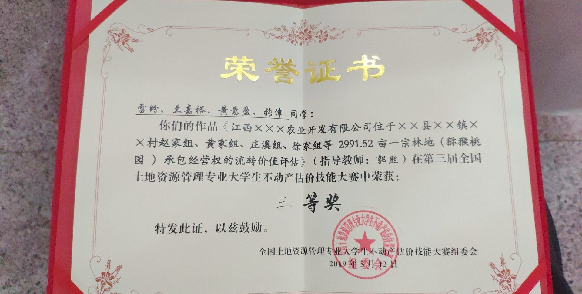 5月11日,第三届全国大学生不动产估价技能大赛在中国矿业大学举行,国土院土地资源管理1601班的雷盼、兰嘉裕、黄意盈、张津四位学生的《江西XX农业开发有限公司位于XX县XX镇XX村赵家组、黄家组、庄溪组、徐家组等2991.52亩一宗林地(猕猴桃园)承包经营权的流转价值评估》作品,经过层层选拔,从全国各大高校的优秀作品中脱颖而出,荣获此次大赛的三等奖。(稿源:国土院学工办)