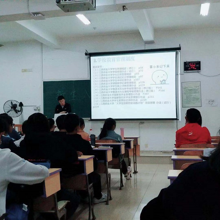 11月5日至11日,为了加强新生对校规校纪的认识,深化文明养成教育,扎实推进学风建设,农学院组织2018级新生开展“慎思笃行树学风新貌,好学力行做六有青年”主题班会学习2018版《学生手册》。