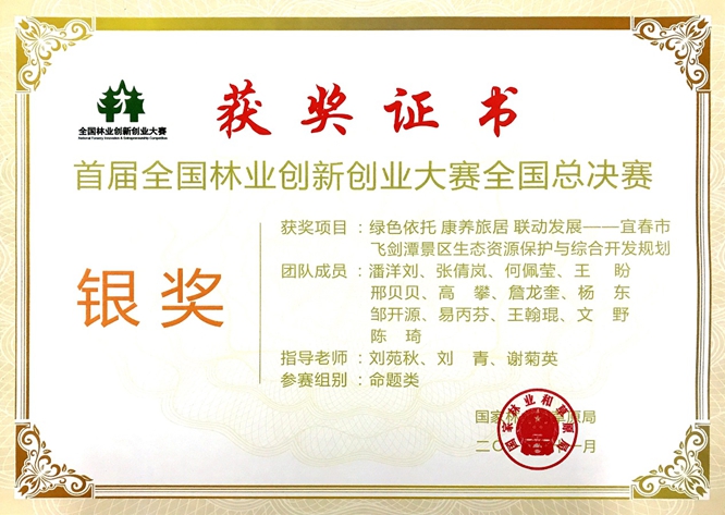 11月28至30日,由国家林业和草原局举办的首届全国林业创新创业大赛全国总决赛在北京林业大学召开。我校园林与艺术学院潘洋刘、张倩岚、何佩莹、王盼、邢贝贝等14位同学组成的林学、园林、环设三个学科的本硕团队,在刘苑秋、刘青、谢菊英等3位老师的指导下,在学院领导的大力支持下,历经五个多月的持续奋战,以《绿色依托康养旅居 联动发展一一宜春市飞剑潭区生态资源保护与综合开发规划》项目代表我校参赛,经过激烈角逐,在全国命题组总决赛中以总成绩排名第二获得银奖,刘苑秋老师获优秀创新创业导师奖。