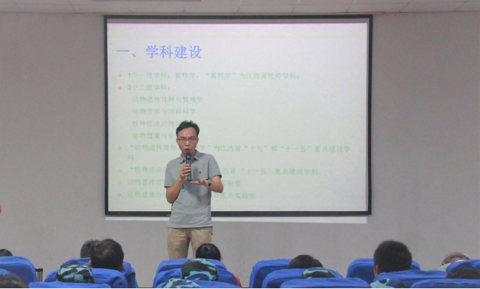 院长胡国良代表学院对2018级新生表示热烈欢迎,向新生详细介绍了学校百年校史、学院八十年发展历程和教学科研、杰出校友等情况,鼓励新生要秉承优良院风,早日规划好人生目标,刻苦学习,为做社会有用之才打下坚实基础。舒邓群教授、邓舜洲教授、刘宝生副教授和熊六凤副教授分别代表动物科学、动物医学、动物药学及水产养殖学四个专业,从师资队伍、教学实践、学科建设、专业前景、兴趣小组活动等方面进行了详细介绍。