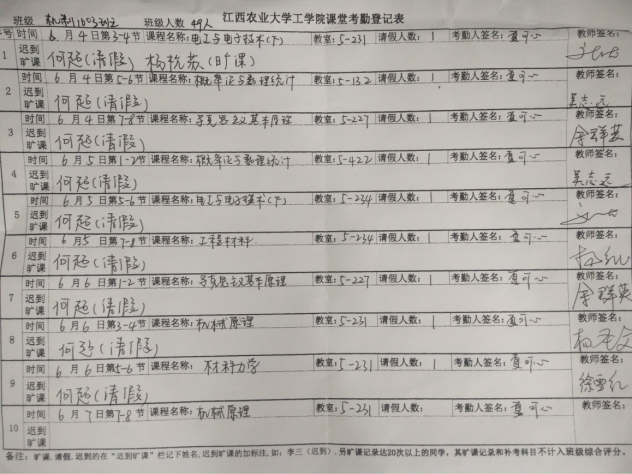 二是全面实施课堂考勤登记,改善课堂教学秩序。为进一步保障学生课堂出勤率,避免学生无辜旷课,促进学院学生课堂教育趋向良性发展。学院采用学生干部与任课老师相结合,由学生对迟到旷课情况统计,教师签名,对班级迟到旷课做了详细记录。其具体情况如下图: