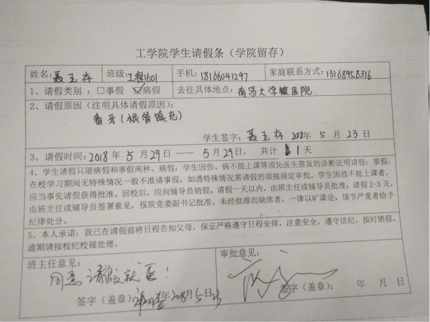 一是规范请假制度,严控学生日常课堂出勤率。在学院党委副书记艾施荣的带领下,工学院学工干部制定了相应的学生请假条,规范了学生请假审批程序。请假条中规定了学生请假只允许事假和病假,并对事、病情况做了详细说明,其真实性由本人承诺和班主任意见相结合。从而严格控制学生请假率,保证课堂出勤率。
