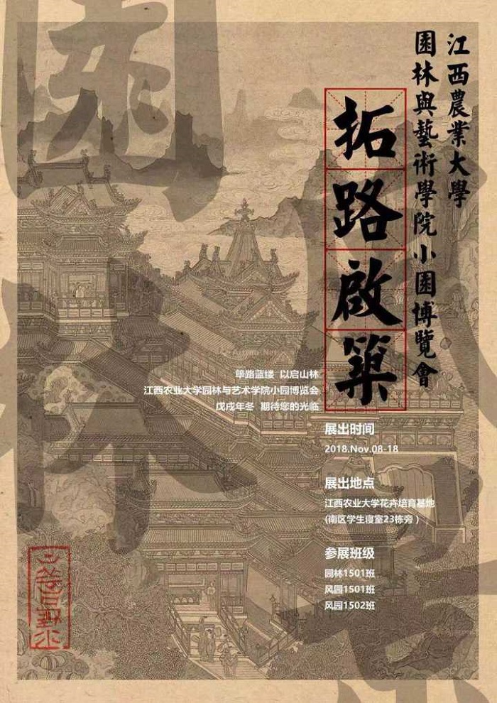 园林与艺术学院“拓路启业”小园博览会展示活动于2018年11月8日—11月18日在江西农业大学园林实训教学基地进行展示。本次活动展由园林1501、风园1501、风园1502《风景园林规划设计综合实训》课程教学成果组成,展示共进行10日。